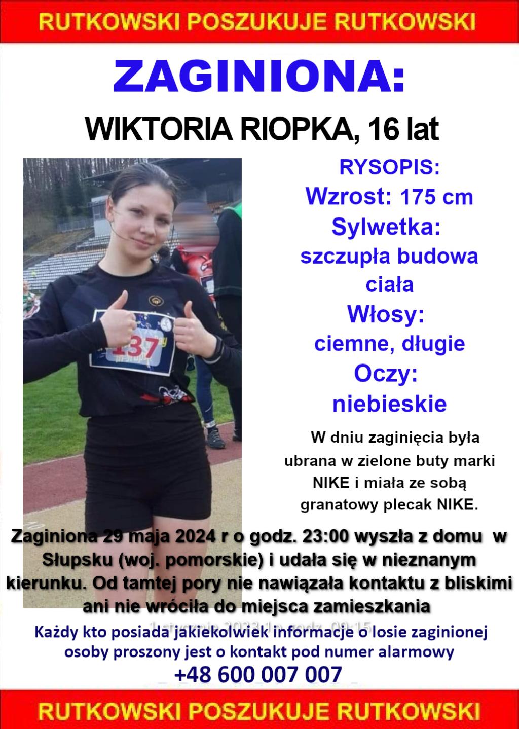 Rodzina i Biuro Rutkowski proszą o pomoc w odnalezieniu Wiktorii. Jeśli ktoś posiada jakiekolwiek informacje dotyczące jej miejsca pobytu, proszony jest o natychmiastowy kontakt z BIUREM RUTKOWSKI NA NUMER ALARMOWY 600 007 007.