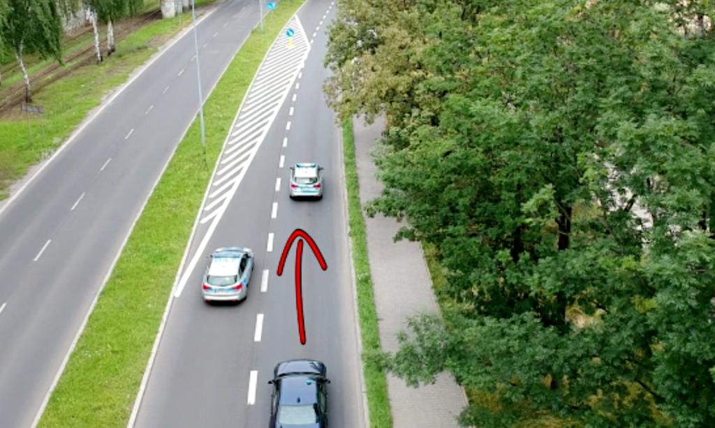 2. Przepuszczanie pojazdu jadącego pasem, który się kończy, obowiązuje na jego końcu, przy samym zwężeniu.