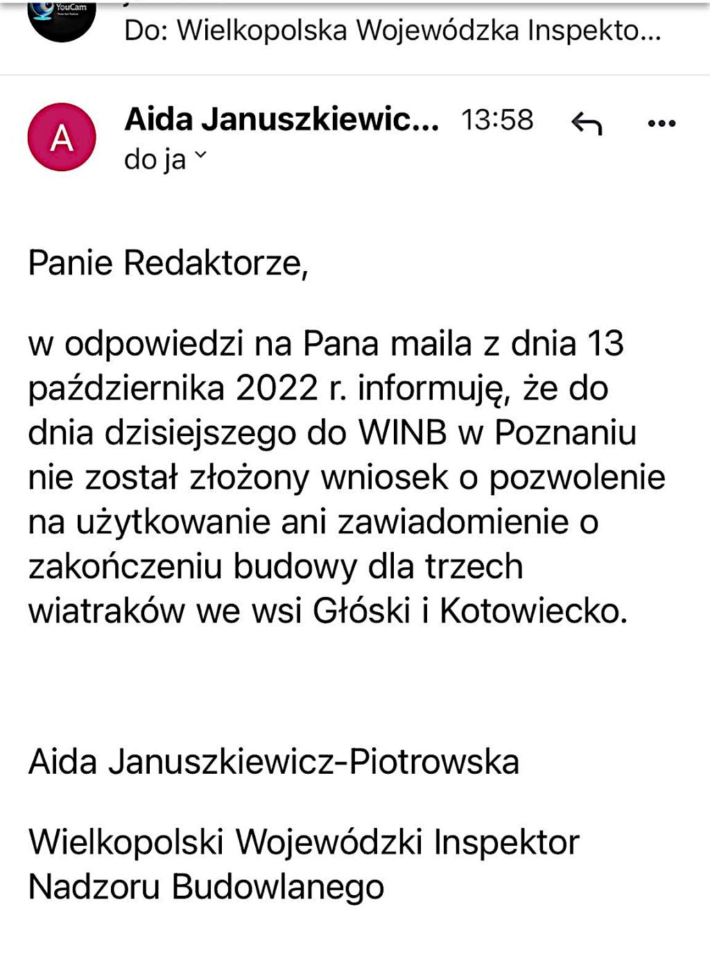 2. Informacji uzyskanej dziś w Wielkopolskim Wojewódzkim Inspektoracie Nadzoru Budowlanego iż przedmiotowa inwestycja to jest 3 wiatraki we wsiach Głóski i  Kotowiecko nie zostały formalnie odebrane przez Wielkopolski Wojewódzki Inspektorat Nadzoru Budowlanego w Poznaniu bo nawet inwestor czyli „Park Wiatrowy Kalisz Północ Sp. z o.o.” nie złożył dotąd wniosku o ich odbiór