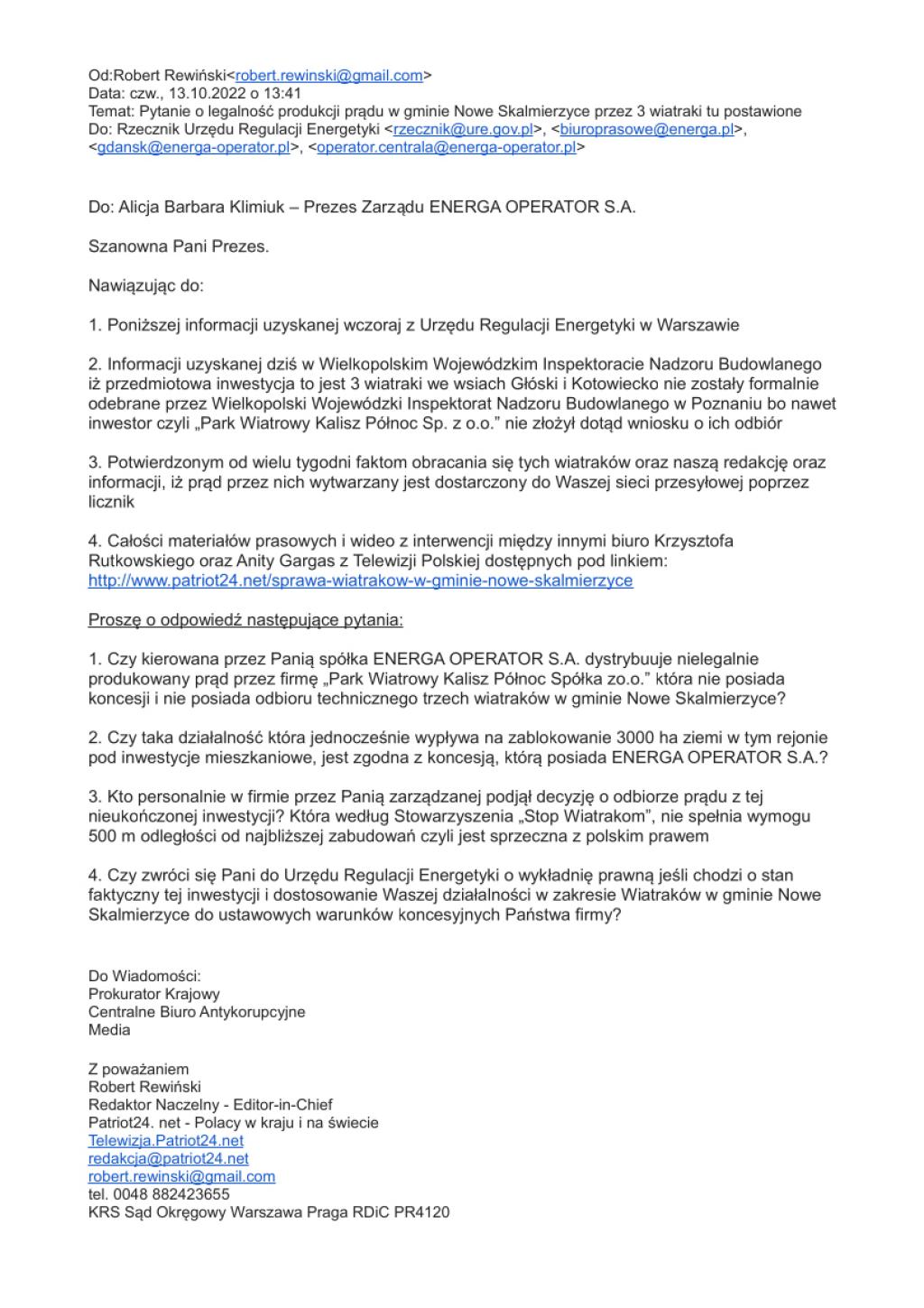 Również czekamy na odpowiedź na tego maila. Tak samo jak na działania warszawskiej policji jeśli chodzi o przesłuchania dotyczące zgłoszenia bezprawnych działań szefa delegatury Państwowej Inspekcji Pracy w Ostrowie Wielkopolskim oraz poświadczenie nieprawdy przez podległą mu inspektor. Chodzi o fakt pracy robotników firmy Siemens przy budowie tych wiatraków, czemu oboje zaprzeczyli!