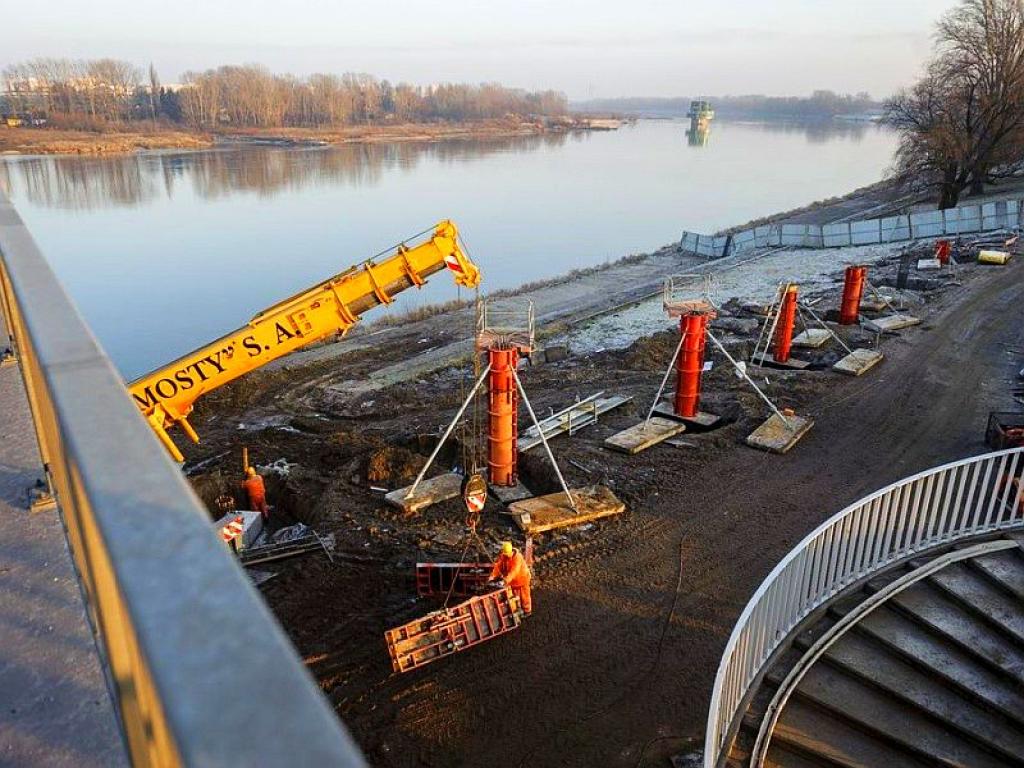 Rozpoczęła się budowa kładki pieszo-rowerowej na moście Łazienkowskim. Na obydwu brzegach rzeki stoją już pierwsze filary, trwa produkcja stalowych elementów kładki. Z nowej przeprawy będzie można skorzystać w wakacje w przyszłym roku.